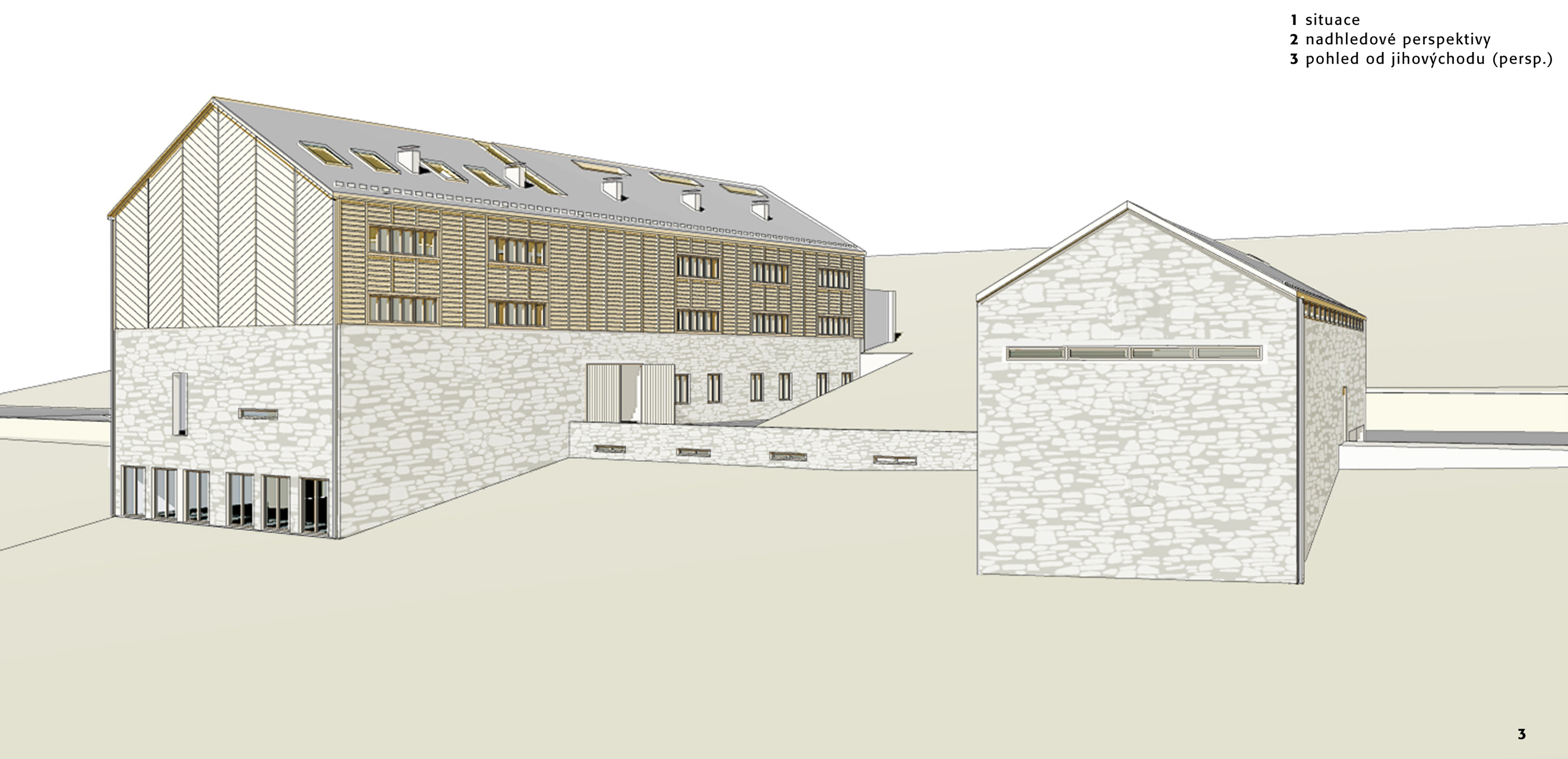 Hlavní objekt A tvoří kamenný sokl s odlehčenou dřevěnou nadstavbou. Objekt přístavku B je chápán jako kamenný monoblok s minimem otvorů (převážně ve střešním plášti). Oba dva objekty jsou propojeny podzemními prostory - objekt C.
