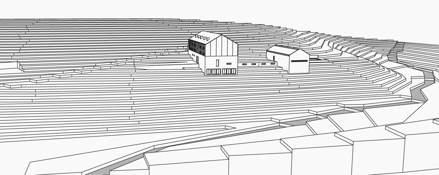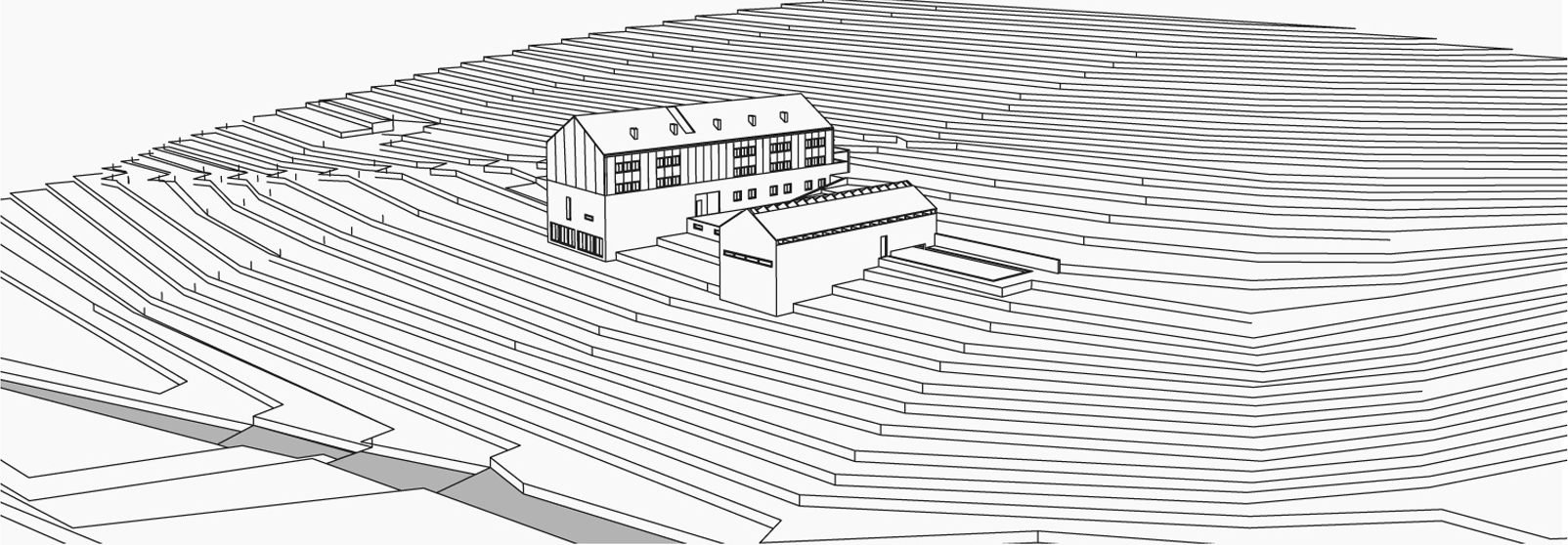 Na základě výše zmíněných urbanistických předpokladů jsou navrženy dvě budovy, které svou polohou napříč terénem a jasnými racionálními protáhlými hmotami se jasně vymezují vůči měkce reagujícímu širokému okolí. Oba objekty jsou dojmově svázány přirozeným propojením po vrstevnici. Vzájemným pootočením kopírují směr spádnice, terén je přirozeně obtéká. Objemy objektů jsou ve vzájemném proporčním vztahu: velký dům (ubytování, stravování) - přístavek (sport).